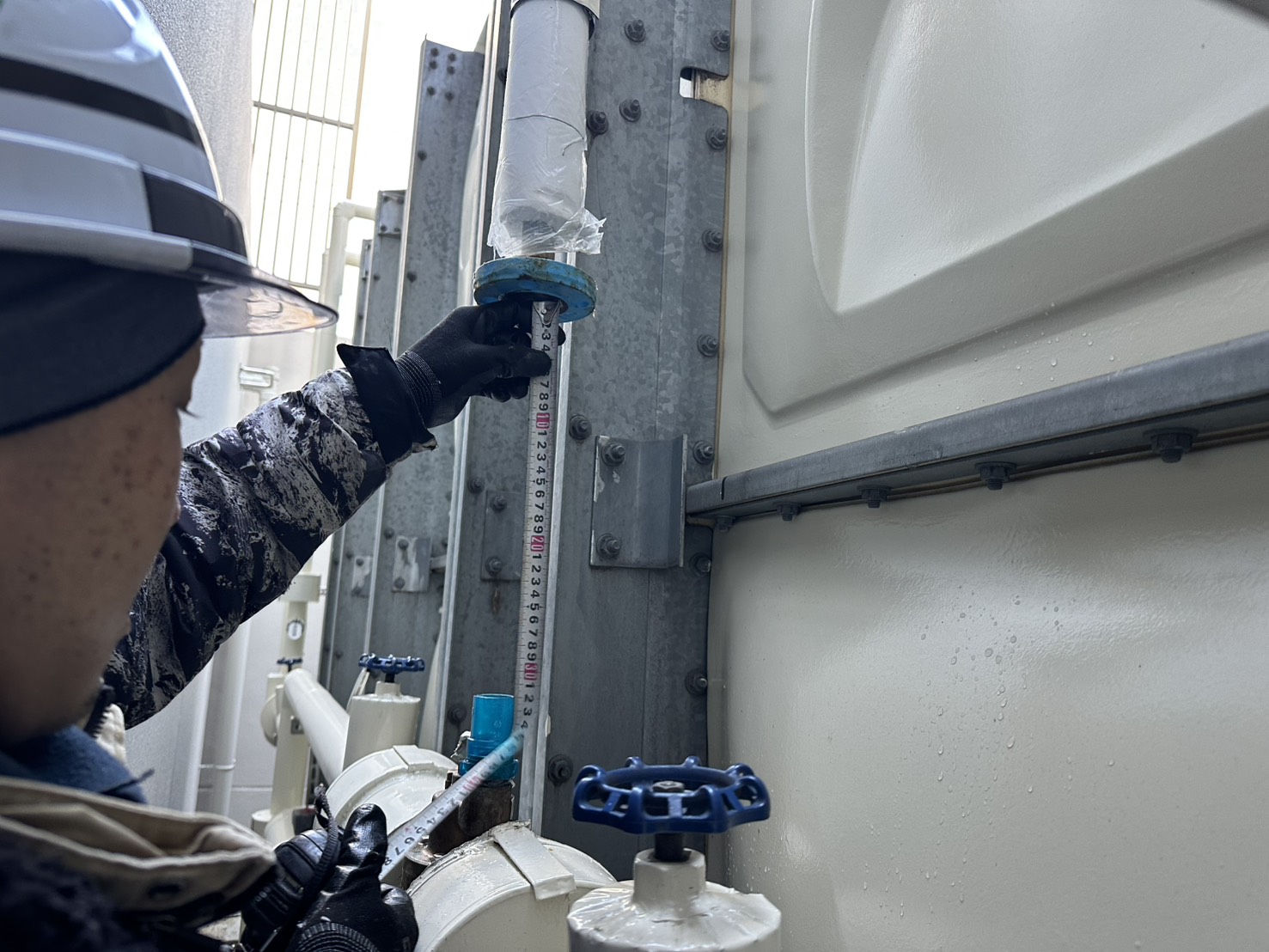 今回の作業では、まず既存配管の寸法確認や接続状況の確認を行い、設備の状態を細かく点検しました。あわせて、バルブまわりやフランジ接続部の状態を確認し、今後の運用に支障が出ないよう必要な整備内容を確認しています。